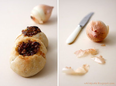 Cebula w tych bułkach jest czymś naprawdę niezwykłym – duszenie jej na patelni z cukrem i ziołami, kiedy mięknie, ciemnieje, nabiera intensywnego koloru i aromatu, następnie jej zapiekanie w bardzo gorącym piekarniku sprawia, że nie można się doczekać końca tego pieczenia. A potem powstrzymać przed jedzeniem kolejnej i jeszcze kolejnej (a potem następnej, naprawdę już ostatniej), bułki.