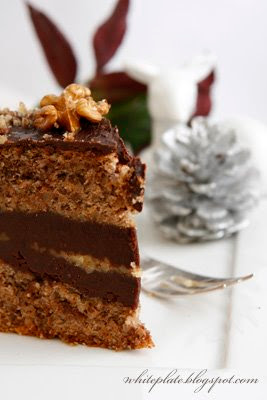 Żółtka utrzeć z cukrem, dodać zmielonych orzechów trzy części (czwartą część zostawić do masy), wanilję i mąkę. Na końcu lekko wmieszać pianę i upiec z tego ciasta dwa placki w dwóch jednakich tortownicach, w miernym piecu uważnie, aby sie ładnie zrumieniły. Po upieczeniu, wyłożć placki i, gdy ostygną, posmarować je masą czekoladową. Po wierzchu oblać lukrem czekoladowym i ubrać połówkami orzechów smażonych w gęstym syropie.