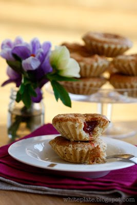 A babeczki? Tradycyjne, typowe – kruchy spód wypełniony bezowo-migdałową masą, którą dodatkowo wzbogaciłam łyżeczką płatków róży w cukrze. Najlepiej smakują pierwszego dnia. Migdały można zastąpić dowolnymi orzechami.