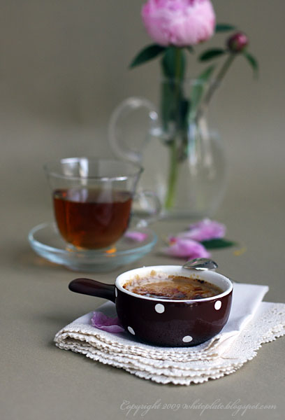 Przelać do 8 płaskich naczynek i piec w kąpieli wodnej przez 30 minut (ja piekłam 60 – przyp. L) w piekarniku nagrzanym do 110 st C.