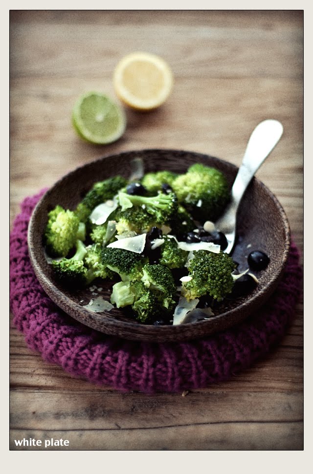 Wyjmujemy na durszlak, polewamy zimną wodą (dzięki temu brokuły zachowają kolor). Kładziemy na talerz, polewamy sokiem z cytryny i oliwą, posypujemy wiórkami sera, oliwkami pokrojonymi na połówki, migdałami lub orzechami. Solimy i pieprzymy.