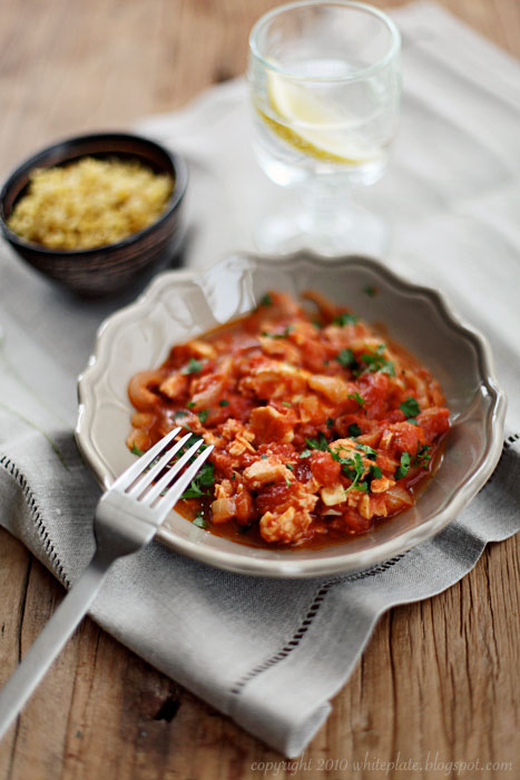 Dodać filet z ryby, pomidory, zamieszać i gotować na bardzo małym ogniu ok. 15-20 minut, aż ryba będzie ugotowana.