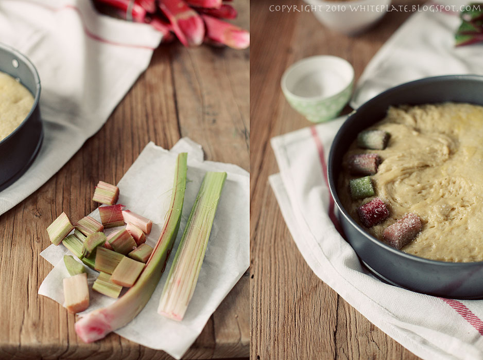 Ciasto z rabarbarem i kruszonką orzechową upiekłam według tego przepisu z następującymi modyfikacjami: