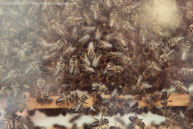 Przy okazji wzięłam udział w pogawędce na temat pszczół (stali czytelnicy bloga wiedzą zapewne o mojej słabości do pszczelarzy ;) i miałam okazję na własne oczy zobaczyć matkę pszczół i przekonać się, czym różni się od pozostałych. Moja córka z zębami zatopionymi w plaster miodu usiłowała nakłonić nas do złożenia obietnicy, że kupimy łąkę i zbudujemy na niej ule. Cóż, może na emeryturze ;)