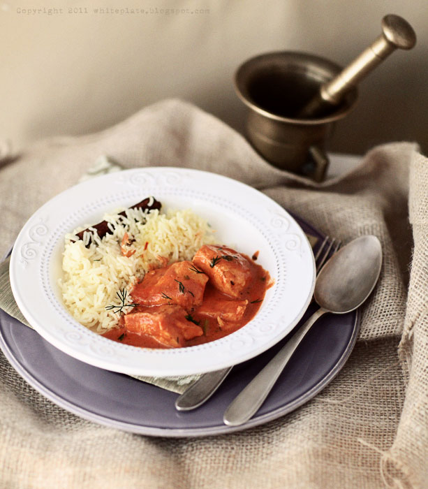 Lubię przepisy z historią, wiarygodne i prawdziwe. Ostatnio to danie z indyjskiej restauracyjki pojawiło się w naszym domu. Jest dosyć łagodne – wszystko zależy od ilości pieprzu, który dodamy do marynaty. Ja dawkowałam go oszczędnie ze względu na dzieci.