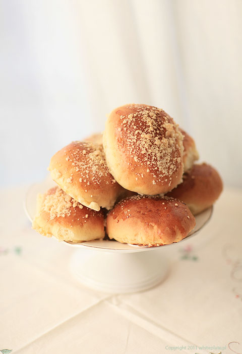 Wyrośnięte bułki posmarować jajkiem wymieszanym z łyżką wody i posypać kruszonką.