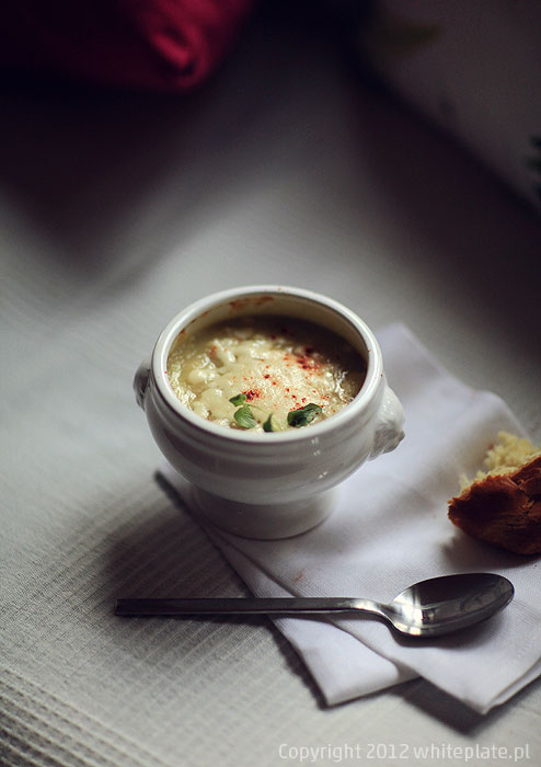 Zmiksować na gładkie puree – jeśli będzie za gęste, dodać więcej wywaru albo śmietany. Doprawić solą, pieprzem, tymiankiem.