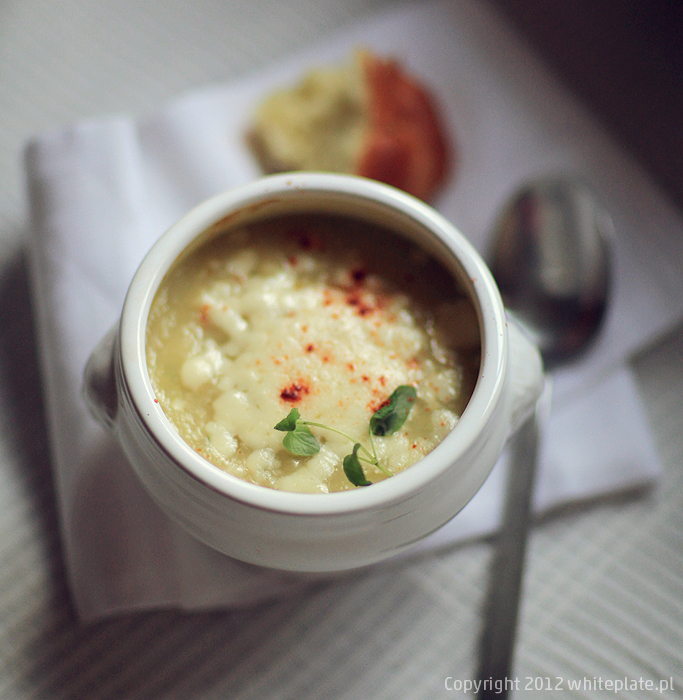 Ser zetrzeć na tarce. Zupę wlać do żaroodpornych misek, posypać serem, wstawić pod rozgrzany grill.