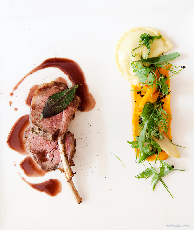 | Comber z jagnięciny, ravioli z zielonym groszkiem, czosnkiem niedźwiedzim, młode warzywa i sos z wawrzynu |