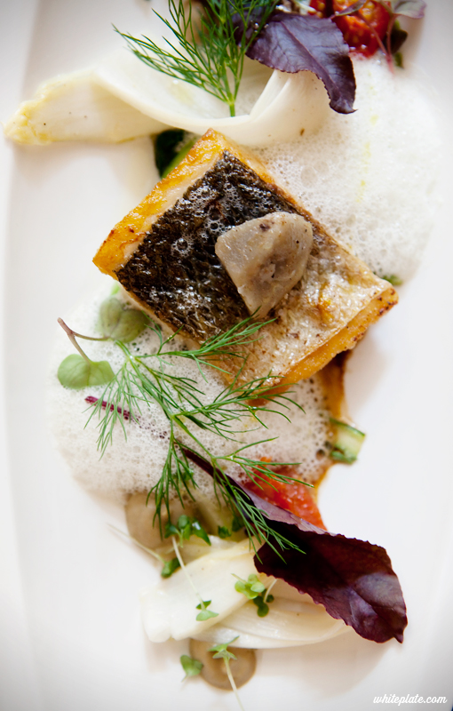| Grillowany okoń morski z koprem włoskim, bakłażanem i pomidorami |