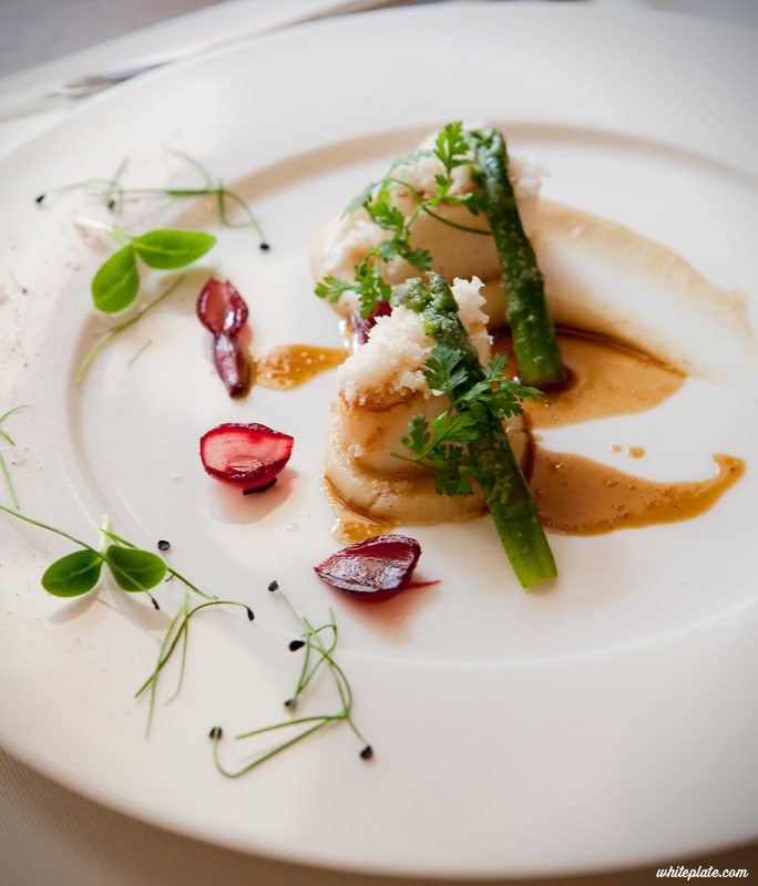 | Potrawka z małży świętego Jakuba z kalafiorem i szparagami, marynowana dymka z wanilią i hibiskusem |