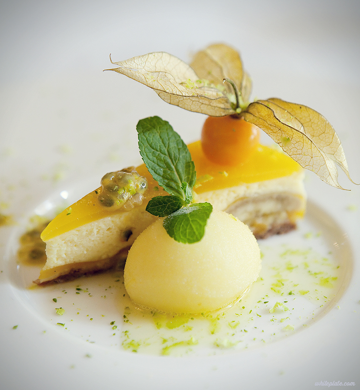 | Mango, marakuja, sorbet z pomarańczy i mięty na cieście (biszkopt migdałowy, crunch czekoladowy, banany) |