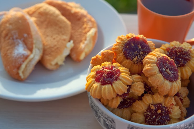 A potem piekarnia, w której odkrywam smaki mojego dzieciństwa, którymi zajadałam się będąc na wakacjach na Podlasiu: Ciastko Omlet przełożone kremem z bitą śmietaną, kruche ciasteczka z marmoladą. Na początku kupuję tylko 10 sztuk a nuż okażą się niedobre. Ale kolejnego dnia wracam po pół kilo czytając w piekarni ich skład: mąka, cukier, jajka, margaryna. Nie ma E, nie ma aromatów identycznych z naturalnymi. Pewnie dlatego są takie dobre.
